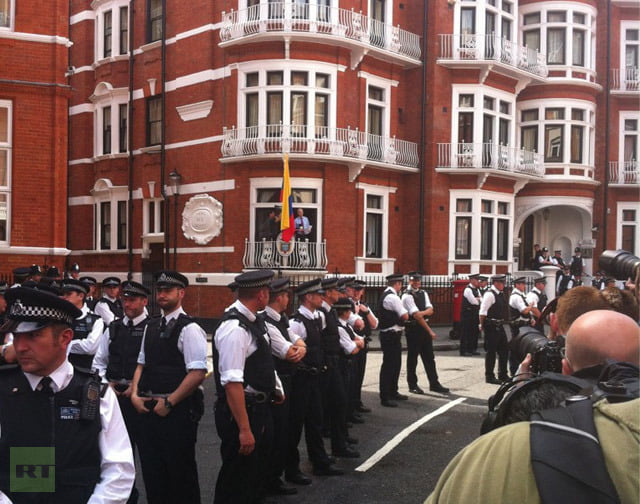 Julian Assange speaks at London’s Ecuadorian Embassy