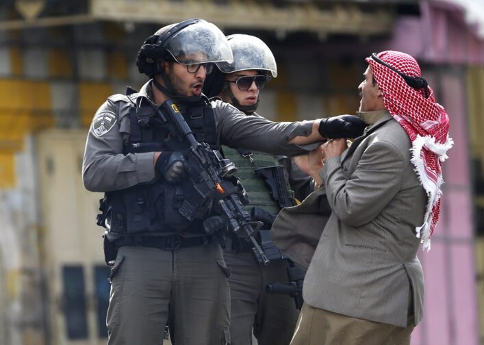 This scene from Oct. 10, 2015, is a typical one in the Israeli-occupied Palestinian West Bank territory. Israeli police rough up a Palestinian man in the streets of Hebron. With Israel vowing to punish Palestinians after more countries recognized their statehood, many expect more deadly violence from the government and ultra-nationalist Jewish settlers. | Nasser Shiyoukhi / AP