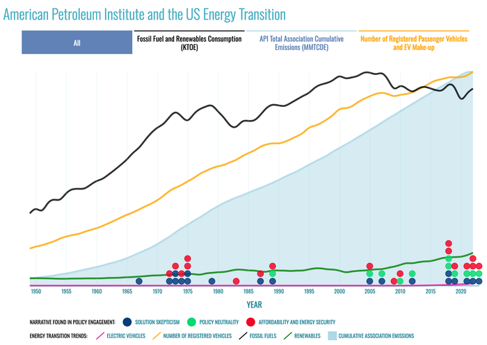 The think tank also made a pair of graphics showing how the trade associations’ documented use of the three narratives aligns with fossil fuel and renewables consumption, association members’ cumulative emissions, and the number of EVs compared with the total number of registered passenger vehicles since the 1950s.