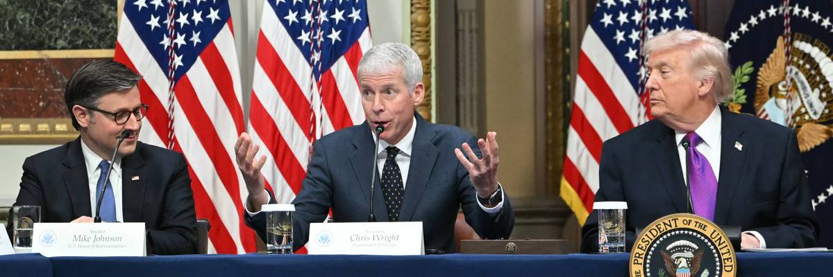 US Speaker of the House Mike Johnson and President Donald Trump listen to Energy Secretary Chris Wright during an event on March 4, 2026.  (Photo by Andrew Caballero-Reynolds/AFP via Getty Images)