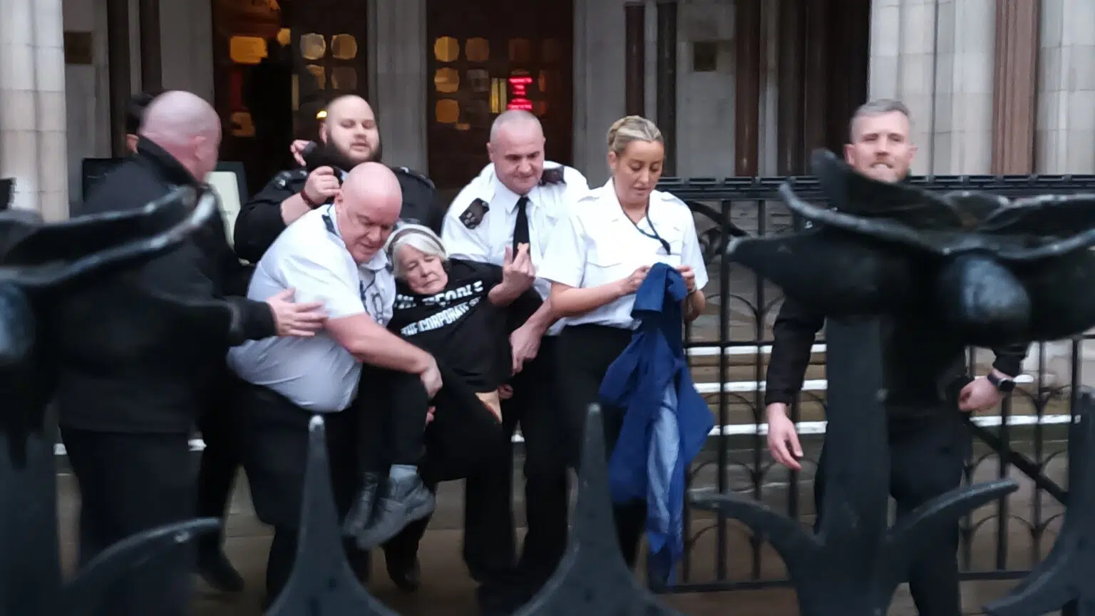 Environmental activist Trudi Warner is ejected from the Royal Courts of Justice on February 21. Credit: Defend Our Juries