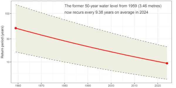 They find that if that planet reaches warming levels of 2C, the likelihood of these conditions could double, to once every 18 years.