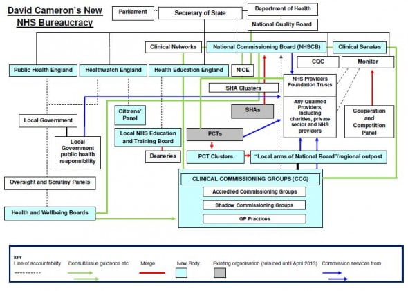 Before the election, David Cameron promised NHS staff there would be no more top-down reorganisation of the NHS, describing its recent history as “like a bowl of alphabetti spaghetti”. His commitment was reiterated in the coalition agreement and was widely welcomed by health service staff. At the latest relaunch of his reorganisation plans, he claimed that he was “taking out a huge amount of bureaucracy” from the NHS.